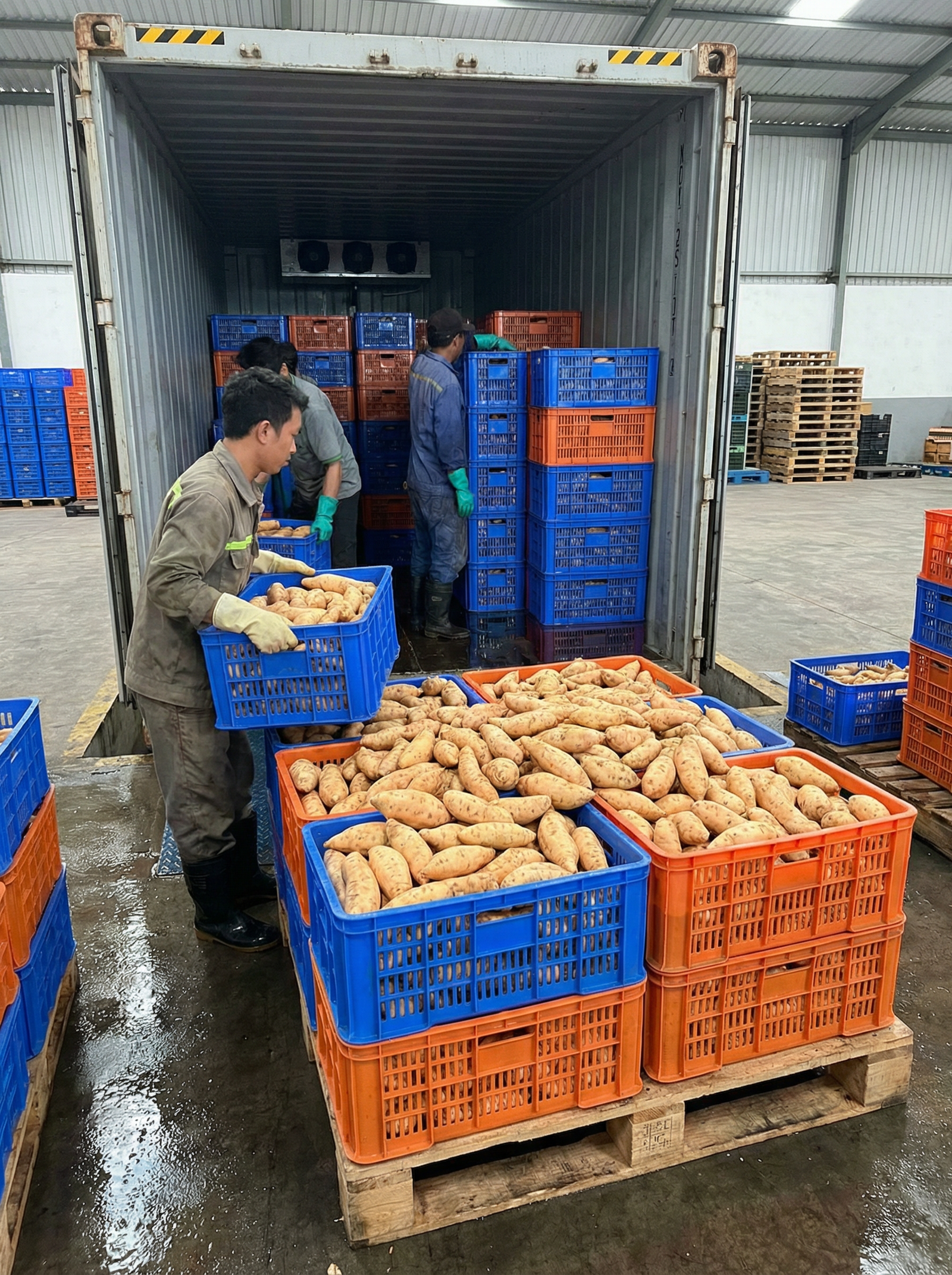 Before packing, tubers are air-dried to prevent moisture buildup, which causes rotting. Typically packed in well-ventilated cardboard boxes or plastic crate to ensure proper airflow during transit.